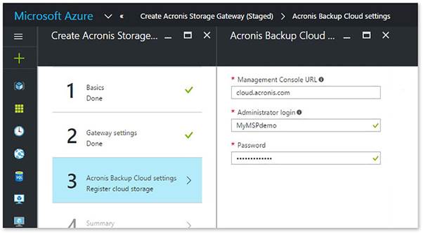 등록된 게이트웨이는 즉시 새로운 고객을 위한 클라우드 데스티네이션으로써 사용할 수 있다. 마이크로소프트(MS) 중심의 서비스 제공업체들은 백업 데스티네이션으로 ‘애저’ 스토리지를 사용하는 것이 보다 용이하다. MS ‘애저’ 내 ‘아크로니스 스토리지 게이트웨이’는 솔루션 템플릿을 통해 손쉽게 설정할 수 있다. 해당 솔루션 템플릿은 소프트웨어를 자동으로 설치하고 ‘애저’ 포털에서 요구되는 정보를 입력하기만 하면 자동으로 실행된다.