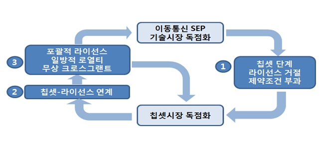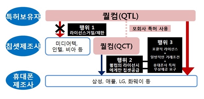 그러나 공정위 조사 결과 퀄컴은 경쟁 모뎀칩셋사의 요청에도 불구하고 칩셋 제도·판매에 필수적인 이동통신 SEP에 대해 라이선스 제공을 거절하거나 제한해왔으며, 칩셋 공급과 특허 라이선스 계약을 연계해 칩셋 공급을 볼모로 FRAND 확약을 우회하면서 부당한 라이선스 계약 체결 및 이행을 강제해온 것으로 드러났다.