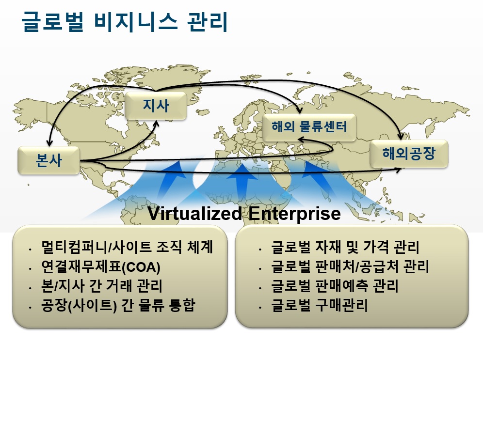 국내 많은 기업들이 세계로 진출하고 있다. 이러한 기업들은 글로벌 비즈니스를 지원하기 위해 한 국가 및 지역 또는 세계에 걸쳐 여러 개의 생산 공장과 지역별 영업점, 물류 창고를 두고 있으며 국내외 지사를 설립하고 있다. 심지어 여러 개의 글로벌 본사를 가지고 있는 기업들도 있다. 이처럼 기업들은 새로운 지역에 진출하면서 비즈니스 운영과 관련해 다양한 도전에 직면하고 있다.