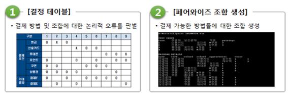 실제로 통합테스트를 수행하는 경우 아래와 같이 결정 테이블을 통해 논리적인 오류를 판별할 수 있으며, 이후 페어와이즈 테스팅을 통해 다양한 조합을 생성하여 테스트 커버리지를 만족시킨다. 이 결과를 바탕으로 통합테스트 케이스를 생성해 테스트를 수행할 수 있다.