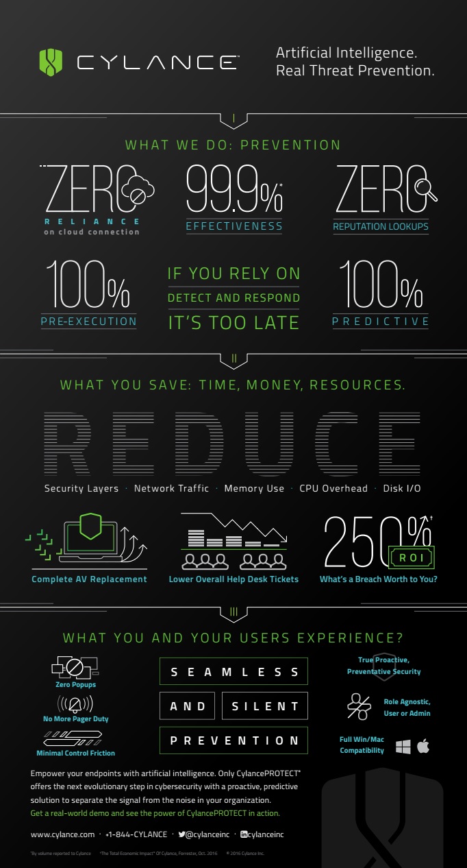 CylancePROTECT는 이전에 전혀 본적 없던 가장 진화된 위협인 APT, 제로데이 공격, 익스플로잇 기술들을 미래지향적으로 방어한다. 더 나아가 실시간으로 바이러스, 웜, 트로이공격, 스파이웨어, 애드웨어 그리고 스팸 까지도 방어해 낸다.