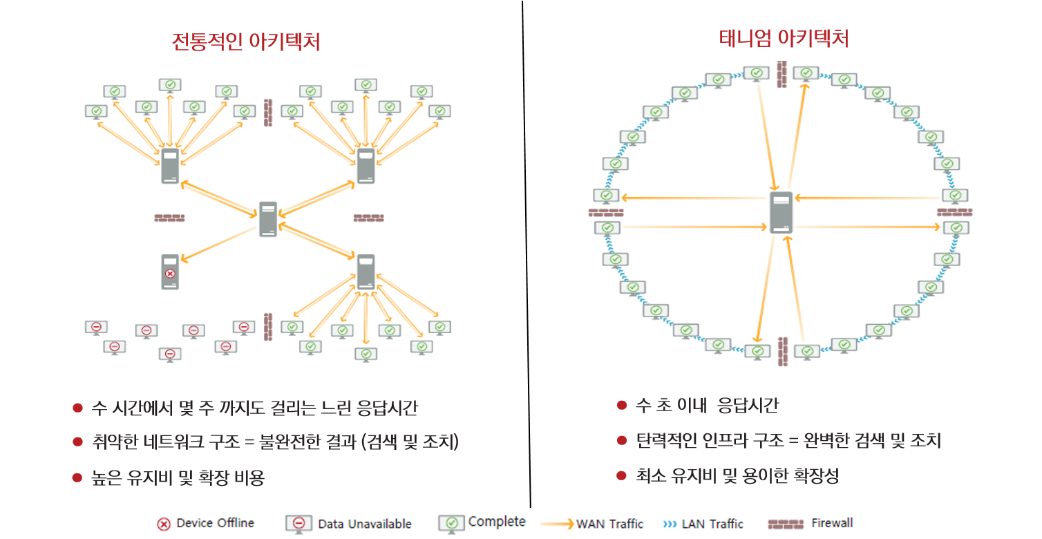 ‘태니엄 엔드포인트 플랫폼’의 엔드포인트 커뮤니케이션 아키텍처는 네트워크상의 모든 엔드포인트에 대해 15초 이내에 가시성 및 컨트롤을 제공하며, 지속적인 인프라의 확충 없이도 손쉽게 수백만 대의 엔드포인트를 대상으로 확장 가능하다.