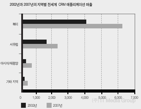 ▲ 2002년과 2007년의 지역별 전세계 CRM 애플리케이션 매출