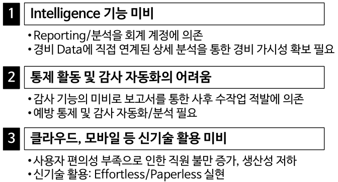 따라서 일부 대기업에서 자체적으로 제작해 사용하고 있는 경비지출관리 시스템으로는 회사 운영과정에서 발생하는 수많은 경비지출내역을 면밀히 검토하기 어려우며, 이를 세부적으로 관리하기 위한 인력과 역량이 필요하다. 결국 많은 부분에서 사람의 손을 필요로 한다는 점은 그대로라고 할 수 있다.