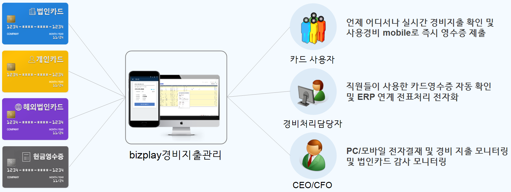 더불어 기업의 ERP 시스템과 연계해 전표 처리를 자동화함으로써 관리비용을 절감할 수 있다. 부가세 신고와 같은 재무담당자의 업무에도 적절한 자료를 자동 생성해 제공함으로써 업무 생산성을 향상시키며, 직원들의 경비사용 내역을 분석하고 성향을 파악함해 효율적인 재무전략 수립을 가능케 한다.