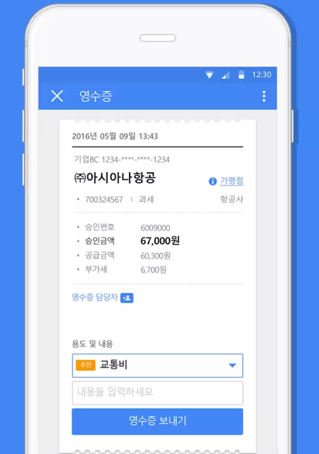 카드 사용 후 결재 내역 혹은 영수증을 스마트폰으로 수신해 자동으로 기업 양식에 맞는 지출보고서를 생성하고, 결재권자는 보고서를 확인하고 해당 지출을 실시간으로 승인할 수 있다.