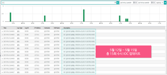 워너크라이는 국내 발견시점이 5월 12일이었다. 이 시점 이후 총 15회의 수시 IOC 업데이트를 통해 현재까지 발견된 워너크라이 관련 악성코드와 변종에 대한 IOC 업데이트를 완료해 최신 랜섬웨어에 실시간으로 대응할 수 있는 체계를 마련했다.