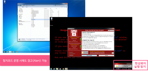 워너크라이 등 랜섬웨어 실행 시에는 자동탐지 모드가 작동해 내부정책상 차단이 아닌 탐지 모드에서도 즉시 탐지가 가능하다. 또한 설정에 따라 랜섬웨어가 PC에 저장(생성, 다운로드 등) 또는 실행되는 순간 차단이 가능하다. 차단된 랜섬웨어 감염파일은 검역소 격리 후 별도 보관되며, 상세정보 확인 및 영구삭제가 가능하다.