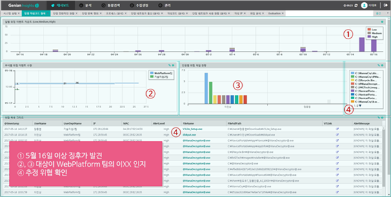 관리자는 대시보드를 통해 이상 징후를 탐지하고 분석할 수 있으며, 해결조치를 위한 대상과 정보를 확인할 수 있다. 또한 ‘분석’메뉴를 통해 위협의 현황을 파악할 수 있으며, 위협의 정도/빈도/대상 등을 확인해 조치 여부 및 순서를 조정할 수 있다.
