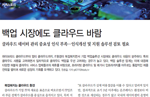 [컴퓨터월드] 하이브리드 클라우드부터 멀티 클라우드까지, IT환경이 복잡해지면서 기업 백업솔루션 시장에도 클라우드 대응이 분주하다. 특히 클라우드 사용을 고려하면서 일차적으로 클라우드 백업을 우선 고려하는 경우가 늘고 있다. 백업 솔루션 업계는 이에 대응해 다양한 퍼블릭 클라우드 서비스 업체들과의 제휴를 바탕으로, 프라이빗 클라우드 및 레거시 인프라까지를 아우르는 통합적인 제품 전략을 펼치며 새로운 성장의 기회를 모색하고 있다.