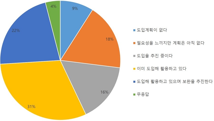 먼저 ‘BI 솔루션 도입 계획을 갖고 있는가’라는 질문에 ‘이미 도입해 활용하고 있다’는 응답이 31%, ‘도입해 활용하고 있으며, 보완을 추진한다’가 22%로 BI솔루션을 도입해 사용하는 기업이 과반을 넘는 것으로 조사됐다. 하지만 ‘아직 도입 계획이 없다’나 ‘도입을 추진하고 있다’는 응답도 43% 수준을 보여 BI솔루션을 활용하고 있지 않은 기업도 상당수 있는 것으로 나타났다.
