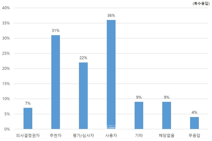 이번 BI 컨퍼런스 참가자에게 BI 프로젝트에서의 역할을 물어봤다. 응답자 중 36%는 ‘사용자’라고 응답해 BI 프로젝트의 실무자가 이번 컨퍼런스에 많이 참여한 것으로 파악된다. 그 뒤로 추천자(31%), 심사자(22%), 의사결정권자(7%) 등이었다.