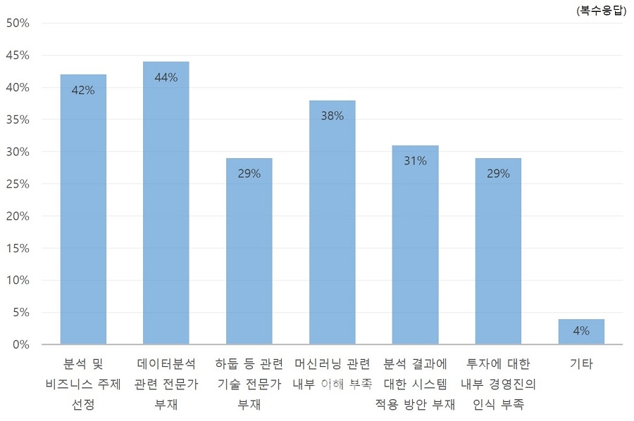‘빅데이터 플랫폼과 연계한 머신러닝 시스템 구축을 추진/검토함에 있어 어려운 점은 무엇인가’라는 질문에 응답자의 절반에 가까운 44%가 ‘데이터 분석 관련 전문가의 부재’라고 응답했다. 또한 응답자의 42%는 ‘분석 및 비즈니스 주제 선정’에 어려움을 겪고 있었고, ‘머신러닝 관련 기업 내부의 이해 부족’이라고 응답한 사람도 38%에 달했다. 더불어 ‘데이터를 분석하더라도 결과를 시스템에 적용하는 방안이 없다’는 응답도 31%로 나타났으며, ‘하둡 등 관련 기술 전문가의 부재’와 ‘투자에 대한 경영진의 인식 부족’이라는 응답도 각각 29%에 달해 문제로 지적됐다.