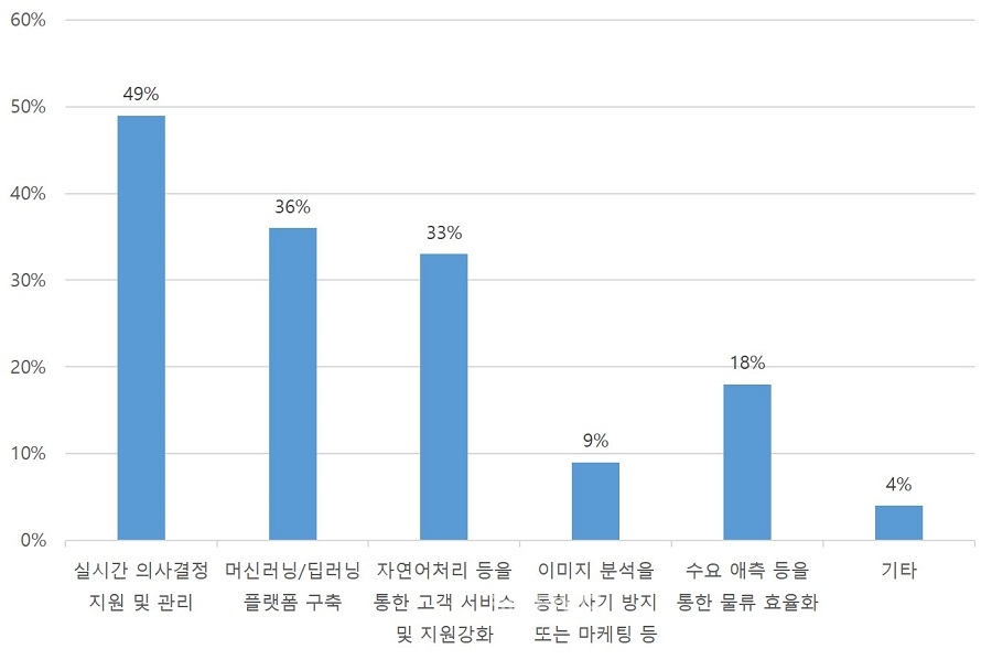 ‘AI플랫폼을 도입한다면 최우선 적용을 고려하는 비즈니스 영역은’이라는 질문에 ‘실시간 의사결정 지원 및 관리’가 49%로 절반을 차지했다. 더불어 ‘머신러닝/딥러닝 플랫폼 구축’에 적용한다는 응답도 36%로 높게 조사됐으며, ‘자연어처리 등을 통한 고객 서비스 및 지원 강화’도 33%로 비슷한 수치를 보였다. ‘수요예측 등을 통한 물류 효율화’는 18%, ‘이미지 분석을 통한 사기방지 또는 마케팅 등’은 9%로 다른 응답에 비해 낮은 수치를 보였다.