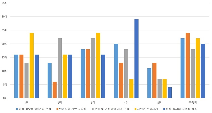 ‘AI/머신러닝 분석 플랫폼 구축을 위한 4가지 영역에서 현재 활용도를 평가한다면’이라는 질문에 ‘하둡 플랫폼 & 데이터 관리’ 부문은 활용도면에서 만족이라고 평가한 응답이 20% 가장 많았다. ‘인메모리 기반 시각화’에서는 그저 그렇다는 평가가 가장 많았으며, ‘분석 및 머신러닝 체계 구축’ 부문에서는 그저 그렇다와 불만족이 40%를 넘었다. ‘자연어 처리 체계’도 그저 그렇다와 매우 불만족이 각각 응답자의 24%라는 수치를 보여 만족도가 떨어지는 것으로 나타났다. 다만 ‘분석결과의 시스템 적용’ 부문에서는 만족이라는 응답이 29%로 가장 높게 나타났다. 이 질문 역시 현재 활용하지 않는다고 답한 기업이 많아 아쉬웠다.