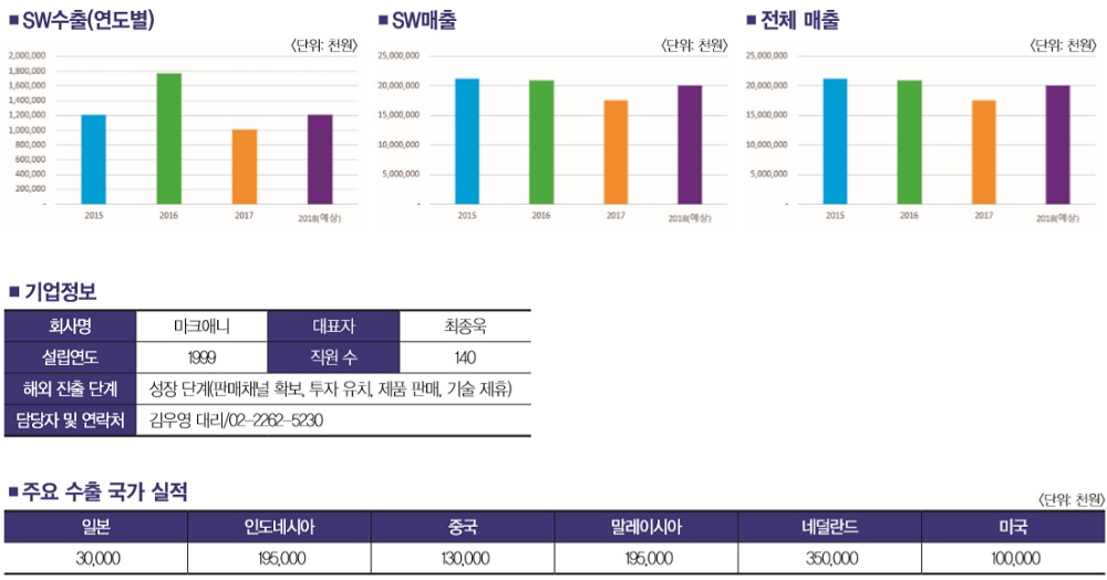 마크애니는 수출을 위해 ▲수출국가 언어지원 ▲고객사 중심 커스터마이징 등을 제공하고 있다. 주로 영상 콘텐츠, 웹툰, 음원 서비스 시장을 공략하고 있으며, 대표적인 레퍼런스로 미국의 유니버셜 뮤직을 꼽을 수 있다.