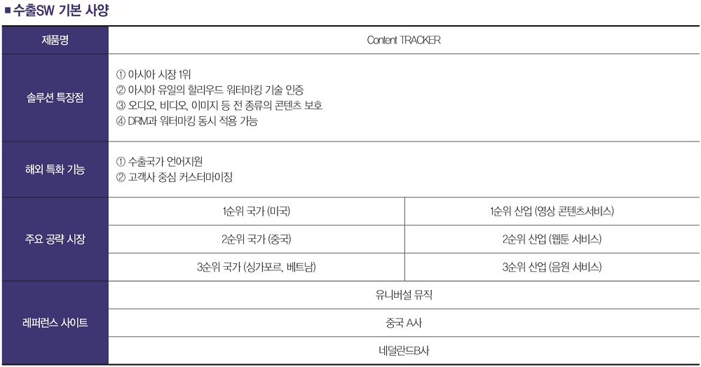 주요 특장점을 보면 불법유출을 추적해 저작권 분쟁 시 삽입된 정보를 통해 소유권 증명 및 소송 증거로 활용 가능하며, 서비스 사용자 정보를 콘텐츠에 입력해 불법 유출시 최초 유포자를 추적할 수 있다. 이 같은 워터마킹 기술은 할리우드 및 무비랩(MovieLabs)과 같은 글로벌 테스트 기관의 기술인증도 받았다. 또 사전 암호화 및 인증절차 없이 사용자에게 원본 콘텐츠를 제공해 이용 편의성을 실현했으며, 고객사의 비즈니스 모델 및 서비스 환경에 따른 맞춤형 워터마크 알고리즘을 지원한다.