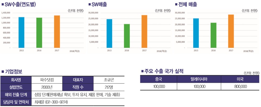 주식회사 파수닷컴(대표 조규곤 www.fasoo.com)은 DRM(문서보안관리) 솔루션을 세계 최초로 상용화시켰고, 2000년 6월 설립과 함께 미국 시장을 타깃으로 수출을 시도해 지금까지 지속적으로 공략하고 있다. “한국의 SW 기업도 글로벌 기업으로 성장할 수 있음을 보여 주겠다”는 조 대표의 꿈은 아직도 진행 중이다. 시행착오를 통한 여러 가지 어려움도 많이 겪었지만 이젠 어느 정도 안정적으로 꾸준히 실적을 올리고 있지만 갈 길이 멀다고 한다. 파수닷컴이 지난해 미국 시장에서 올린 매출실적은 약 8억 원 가량이다. 중국과 말레이시아에서는 각각 1억 원 정도의 실적을 올렸다.