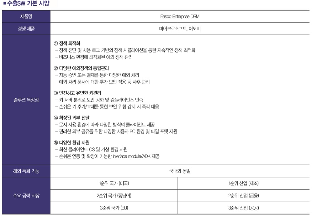 파수닷컴은 국내 대표적인 데이터 보안 솔루션 전문 기업으로 시장점유율이 70%로 관련 분야 선두 주자이다. ‘파수 엔터프라이즈 DRM(Fasoo Enterprise DRM)’과 같은 솔루션은 북미 시장에서도 찾기 힘들만큼 독보적이라고 한다. 파수 엔터프라이즈 DRM은 문서의 내용, 등급, 위치, 사용자의 그룹 및 역할, 디바이스 환경 및 애플리케이션 종류, 시간 등 리치 콘텍스트(Rich Context) 정보를 활용하여 열람, 편집, 인쇄 및 워터마크 인쇄, 캡처 등 문서에 대한 사용자의 세부 권한을 유연하고 동적으로 적용할 수 있도록 개발했다고 한다.