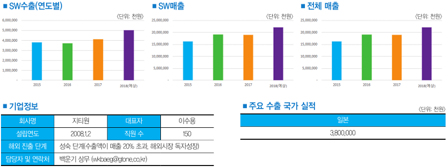 지티원은 지난 2008년 9월 설립, 최근 창립 10주년을 맞이했지만 사실은 지난 1998년 설립한 아이티플러스가 전신이다. 다시 말해 20년째 솔루션 개발 공급 전문기업으로 성장 발전해 오고 있다. 지티원은 새 출발을 하면서 목표를 해외시장 진출을 설정했다. 즉 솔루션 개발 자체를 글로벌 표준에 맞춰 개발했고, 특히 까다롭기로 정평이 나 있는 일본 시장에서의 승부를 1차 공략목표로 설정, 14년여 전인 지난 2004년 설립한 일본 지사를 적극 활용했다.