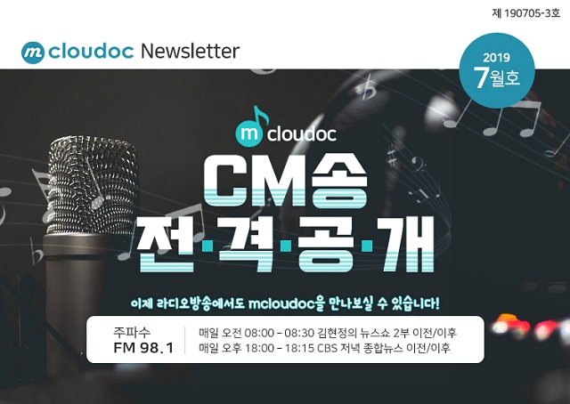 한국방송광고진흥공사 주관으로 시행되고 있는 ‘2019년 혁신형중소기업 방송광고 활성화 지원사업’에서 엠클라우독은 기업의 성장성, 안정성 그리고 상품경쟁력 부분에서 고득점을 얻어 사업에 최종 선정됐다. 이를 통해 엠클라우독은 2개월에 걸쳐 CM송을 제작했으며, 7월 1일부터 라디오 송출을 시작했다. 엠클라우독의 CM송은 매일 오전 8시, 오후 6시에 표준 FM 98.1mhz 에서 청취가 가능하다.