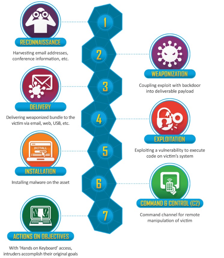 미국 군수업체인 록히드마틴(Lockheed Martin)이 처음 정의한 ‘사이버 킬체인(Cyber Kill Chain)’은 공격을 ▲정찰(Reconnaissance) ▲공격코드 제작(Weaponization) ▲전달(Delivery) ▲취약점 공격(Exploitation) ▲설치(Installation) ▲명령 및 제어(Command and Control) ▲목표시스템 장악(Actions on objectives) 등의 7가지 단계로 나눈다. 각 단계에서 공격이 심화되기 전에 미리 그 구성요소를 파악해 공격 단계 중 일부를 무력화 또는 지연시켜 공격 효율을 낮추고 피해를 최소화 하는 것이 사이버 킬 체인의 주요 개념이다.