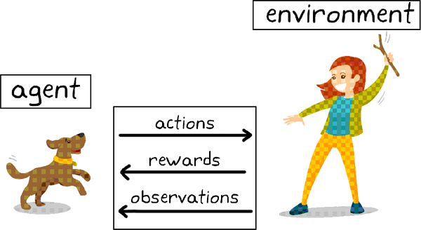 이 경우에 강화 학습의 목표는 개(에이전트)를 훈련시켜서 어떤 환경 속에서 과제를 완수하도록 하는 것이고, 조련사뿐만 아니라 개의 주변도 환경의 일부이다. 먼저 조련사가 어떤 명령이나 단서를 제공한다. 개는 그것을 관찰한다(관찰). 이어서 개가 어떤 행동을 취하며 반응하게 된다. 만일 그 반응이 원하는 행동에 근접하였다면 조련사는 간식이나 장난감 같은 보상을 제공하고, 아니라면 보상하지 않거나 부정적인 보상을 줄 것이다.