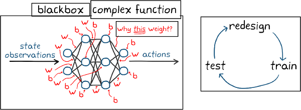 훈련된 딥 뉴럴 네트워크 정책은 ‘블랙박스’로 간주된다. 뉴럴 네트워크의 내부가 복잡한 파라미터 수백만 개로 구성돼 있기에, 네트워크의 결정을 이해하고 평가하는 것이 불가능에 가깝다(<그림 3> 왼쪽). 그래서 뉴럴 네트워크 정책은 공식적인 성능 보증이 어렵다. 이 문제는 애완동물을 훈련시킬 때 주인이 내린 명령을 인식하지 못하는 경우를 통해 알 수 있다.