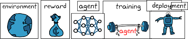 먼저 에이전트가 작동하는 환경을 정의해야 하며, 이때 에이전트와 환경 사이의 인터페이스도 정의해야 한다. 환경은 시뮬레이션 모델 또는 실제의 물리적 시스템이다. 시뮬레이션 환경은 더 안전하고 실험도 가능하므로 첫 단계로 적절하다(실제 하드웨어는 비싸다!).