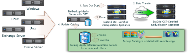 베리타스 오픈 스토리지(Veritas Open Storage, OST)는 백업 스토리지와의 효율적인 연동 구성을 통해 오프사이트 데이터 보호 운영 환경의 효율성을 높일 수 있으며, 아래 지원 기능을 포함하고 있다.