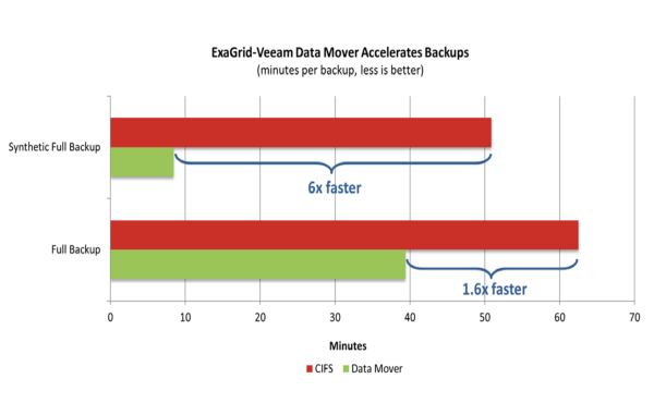 빔 데이터 무버(Veeam Data Mover)와 통합된 백업 스토리지 솔루션을 사용할 경우 일반적인 CIFS를 활용한 스토리지 대비 최대 30% 이상 향상된 데이터 쓰기 성능의 이점을 토대로 모든 백업 및 복구 작업의 프로세스가 향상된다. 더불어 통합(Synthetic) 백업을 활용해 백업 서버에 이미 저장되어 있는 증분(Incremental) 데이터를 이용, 전체 백업본을 새로 만들기 때문에 네트워크 사용량을 줄일 수 있다.