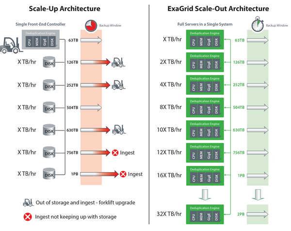 현재 출시된 대다수의 중복제거 어플라이언스는 스케일-업 방식을 사용함으로써 데이터 증가에 따라 백업 및 복구 성능 감소를 유발하게 된다.