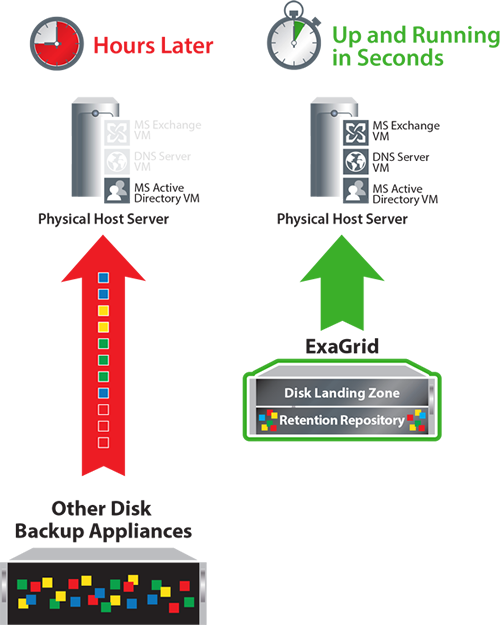 특히 데이터 증가에 맞춰 시스템에 백업 장비를 추가하지 않아도 되는 제품을 제공하는 기업은 엑사그리드가 유일하다. 엑사그리드의 독자적인 랜딩 존(Landing Zone)은 가장 최신 백업의 전체 사본을 디스크에 보관해 가장 빠른 복구, 수 초에서 수 분의 VM 부팅, 인스턴트 DR(Instant DR) 및 빠른 테이프 복제를 제공한다.