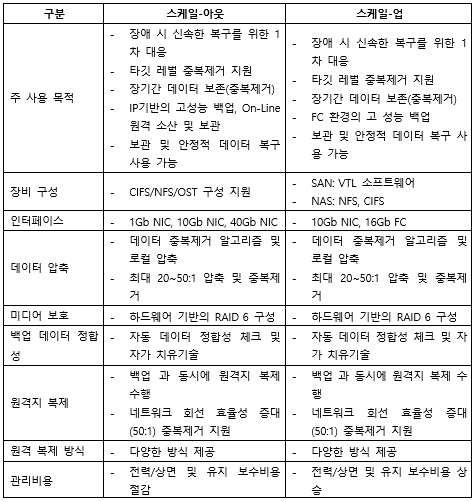 일반적인 비즈니스 또는 조직에서는 데이터가 기하급수적으로 증가하고 있다. 이러한 데이터는 매년 30% 이상씩 증가하고 있으며 2.5년 마다 기존 데이터 대비 2배로 증가하고 있는 추세이다. 데이터 증가는 IT 인프라의 관리 및 운영에도 늘 많은 과제를 안겨주고 있다. 백업 스토리지 솔루션 역시 증가하는 데이터 보호의 요건에 맞추기 위해 스케일-업(Scale-up)과 스케일-아웃(Scale-out)의 두 가지 유형의 구성 환경을 마련할 수 있다.