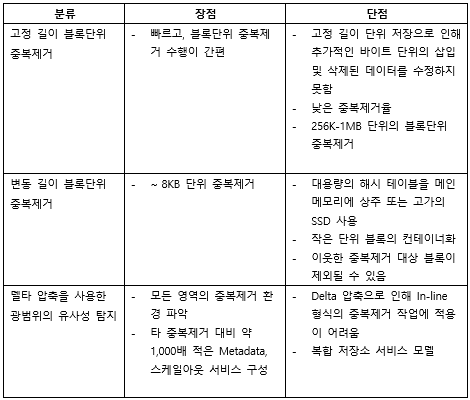 중복제거에 대한 각 공급업체별 내용은 아래 표에서 간략히 비교해 볼 수 있다.