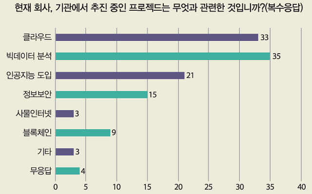 ![]() 현재 회사 및 기관에서 추진하고 있는 프로젝트는 ‘빅데이터 분석(28.5%, 35명)’이 가장 많은 것으로 나타났다. 이어 ‘클라우드 전환(26.8%, 33명)’이 뒤를 이었다. 각 기업들의 IT 관련 화두가 ‘빅데이터 분석’과 ‘클라우드’인 것을 확인할 수 있었다. 이외에 ▲인공지능 (17%) ▲정보보안(12.1%) ▲블록체인(7.3%) ▲사물인터넷(2.4%) 등에도 관심을 보였다.
