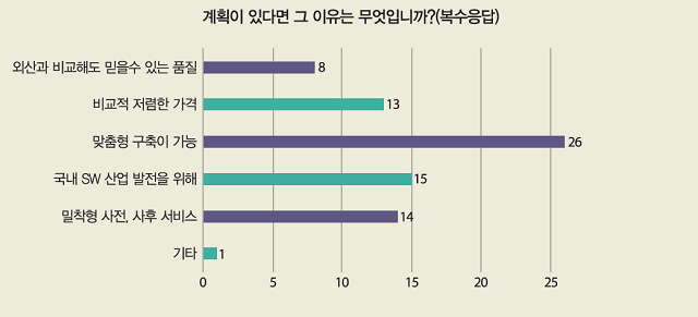 ![]() 국산 SW를 사용해 프로젝트를 진행할 계획이 있다고 답한 응답자 중 44%(26명)는 맞춤형 구축이 가능해 국산 SW를 사용할 것이라고 답했다. ▲국내 SW 산업 발전을 위해(21%) ▲밀착형 사전, 사후 서비스(20%) ▲비교적 저렴한 가격(18%) ▲외산과 비교해도 믿을 수 있는 품질(11%) 등이 뒤를 이었다.