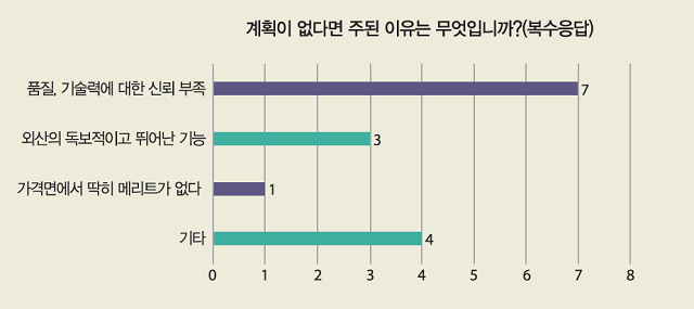 ![]() 또한, ‘국산 SW를 사용해 프로젝트를 진행할 계획이 있는가’라는 질문에 계획이 없다고 답한 응답자 11명 가운데 7명은 품질과 기술력에 대한 신뢰부족을 이유로 꼽았다. 이 외에도 ‘외산의 독보적이고 뛰어난 기능’이 3명, 가격 측면에서 메리트가 없다고 답한 사람(1명)도 있었다. 한편, 기타 의견 가운데 ‘전문 SW 측면에서 국산 SW는 아직 이용할만한 단계가 아니다’ 등이 제시됐는데 이는 외산 SW의 품질과 기술력을 국산 SW가 따라가지 못한다는 인식이 반영된 것으로 보인다.