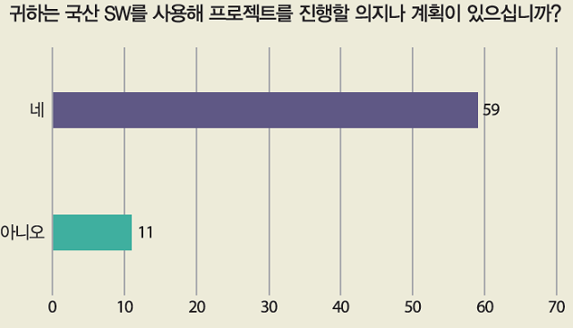![]() 응답자의 84.2%(59명)가 국산 SW를 사용해 프로젝트를 진행할 의지나 계획이 있다고 답해 국산 소프트웨어의 가능성이 높다는 사실을 보여줬다. 그러나 국산 SW를 사용해 프로젝트를 진행할 계획이 없다고 답한 사람도 11명(15.8%)으로 적지 않았다.