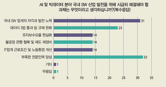 ![]() 국내 SW 산업 발전을 위해 시급히 해결돼야 할 과제로 ‘부족한 전문 인력 양성’이 꼽혔다. 응답자 가운데 45.7%(32명)가 국내 SW 산업을 발전시키기 위해 전문 인력이 보다 많이 필요하다고 답했다. 또한 ‘국내 SW 업계의 자각과 발전 노력’이 필요하다는 응답 또한 44.2%(31명)로 높은 수치를 보였다. 다음으로 ▲데이터 3법 통과 등 규제완화(32%) ▲유지보수요율 현실화(20%) ▲불공정 관행 철폐 및 제도 재정비(20%) ▲업계 근로조건 및 노동환경 개선(20%) 등이 뒤따랐다.