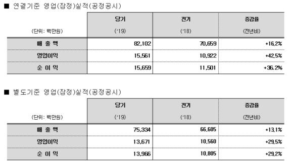 이는 전년대비 연결기준으로는 매출액은 16.2%, 영업이익은 42.5% 증가했으며, 별도기준으로 매출 13.1%, 영업이익 29.5% 증가한 수치다.