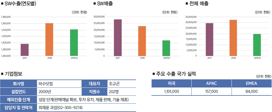 파수닷컴(대표 조규곤 www.fasoo.com)은 DRM(문서보안관리) 솔루션을 세계 최초로 상용화시켰고, 2000년 6월 설립과 함께 미국 시장을 타깃으로 수출을 시도해 지금까지 지속적으로 공략하고 있다. 그러나 미국 데이터 보안 시장의 DRM 분야는 아직도 초기단계이다. 그만큼 파수닷컴의 성장가능성이 높다고 할 수 있다. 파수닷컴은 지난해 DRM 솔루션에 데이터 식별 및 분류 솔루션을 추가시킨 솔루션, 즉 데이터 보호의 첫 단계부터 마지막까지 모두 지원하는 통합된 솔루션을 공급했다. 이 제품은 고객 접근성과 범위가 월등히 커졌고 신뢰도도 높아져 실적증대로까지 이어졌다.
