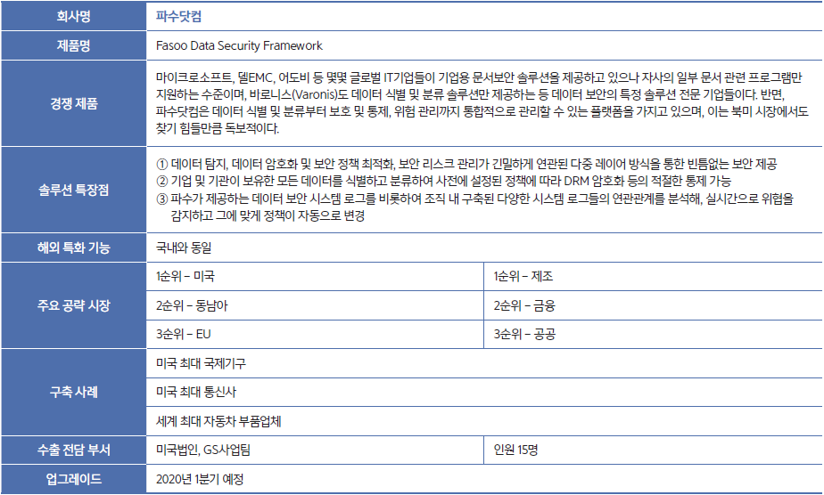 파수닷컴의 주요 수출 솔루션은 ‘Fasoo Data Security Framework’이다. 이 제품의 주요 특징을 보면 ▲데이터 탐지, 데이터 암호화 및 보안 정책 최적화, 보안 리스크 관리가 긴밀하게 연관된 다중 레이어 방식으로 빈틈없는 보안 솔루션이고, ▲기업 및 기관이 보유한 모든 데이터를 식별하고 분류하여 사전에 설정된 정책에 따라 DRM 암호화 등의 적절한 통제 가능하고, ▲파수가 제공하는 데이터 보안 시스템 로그를 비롯해 조직 내 구축된 다양한 시스템 로그들의 연관관계를 분석해 실시간으로 위협을 감지하고 그에 맞게 정책이 자동으로 변경이 가능하다고 한다.