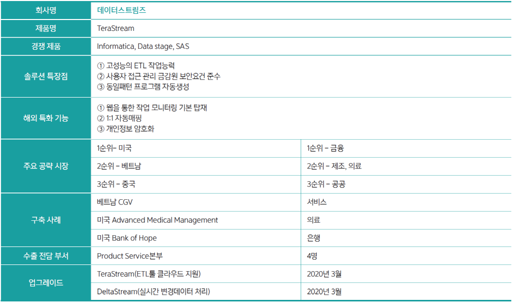 데이터스트림즈의 대표적인 수출 제품은 ‘테라스트림(TeraStream)’이다. 이 제품은 다양한 형태의 데이터를 추출, 변환 및 적재 할 수 있는 고성능 데이터 통합 솔루션이다. 즉 대량의 데이터를 추출하고 변환하여 배포하는 GUI 기반의 고성능 기업 데이터 통합 솔루션이다.