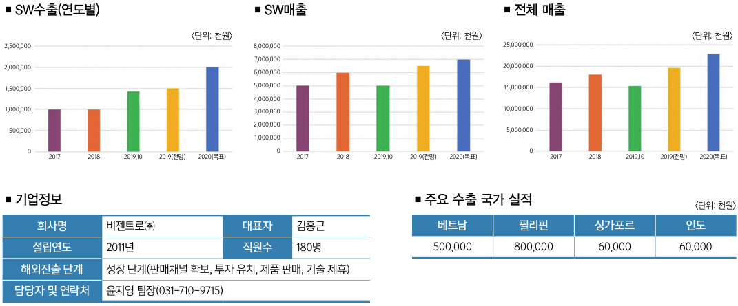 “지난해 수출 실적은 약 14억 2,000만 원으로 전년대비 약 28% 성장했고, 목표인 15억 원에는 약간 부족했지만 어려운 경제상황을 고려한다면 그렇게 나쁘진 않았다고 생각한다. 아무튼 성장은 적극적인 해외사업, 예를 들어 제품 현지화 등을 통해 고객들로부터 좋은 반응을 얻었다고 본다.” 비젠트로는 중국, 베트남, 인도 등에 주로 수출을 많이 한 것으로 파악된다. 지난해와는 어떻게 달라졌나. “2019년 해외 진출의 주력 포인트는 BIZENTRO Digitalization(자동화, 인공지능화) 플랫폼을 국내외에 소개하는 한 해였다. 베트남의 경우 호치민, 박닌시 등의 전시를 통해 그동안 준비해온 기술력을 소개했다. 특히 이를 통해 스마트 팩토리 전문기업으로서의 인지도 상승은 물론 한층 더 도약할 수 있었던 계기를 마련했다고 본다. 지난해는 이들 국가 외에 싱가포르 고객, 다시 말해 신규 시장 진입도 했다.”