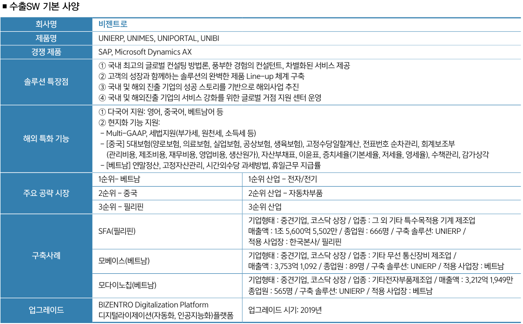 비젠트로의 대표적인 수출 제품군은 UNIERP, UNIMES, UNIPORTAL, UNIBI 등이다. 즉 비젠트로의 정통 솔루션인 UNIERP, 중소기업 스마트팩토리 용인 UNIMES, 통합업무 솔루션인 UNIPORTAL, 그리고 BI 솔루션인 UNIBI 등이다. 비젠트로는 자사의 성장 기반이자 정통 솔루션인 UNIERP와 다른 솔루션들을 연계시켜 시장을 공략한다는 것이다. 즉 ERP 전문기업으로서 고객들이 필요로 하는, 특히 인공지능과 빅데이터 IoT 등의 최신 기술을 접목시킨 제품군(Line-up)을 갖췄다. 한마디로 원스톱 솔루션 지원체계를 갖췄다고 할 수 있다.