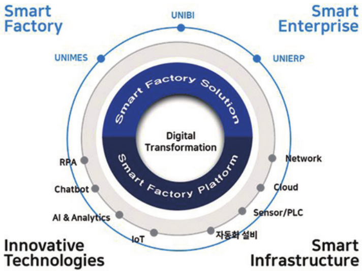비젠트로는 이 같은 실적을 바탕으로 공략시장을 스마트팩토리 분야로까지 확대해 나가고 있다. 이를 위한 전략으로 지난해 ‘디지털라이제이션(Digitalization) 플랫폼’을 발표했다. 이 플랫폼은 자사의 대표 제품인 ‘유니ERP(UNIERP)’, ‘유니MES(UNIMES)’, ‘유니 BI(UNIBI)’, ‘유니포털(UNIPORTAL)’ 등에 IoT·RPA·챗봇·애널리틱스 등과 같은 최신 기술들을 접목시켜 성공적인 스마트팩토리를 구축한다는 것이다. 즉 값비싼 외산 솔루션들을 구매하지 않아도 자사의 디지털라이제이션 플랫폼을 통해 최신 기술을 접목한 스마트팩토리를 구축할 수 있다는 것이다. 다시 말해 이 플랫폼은 PLC, 로봇, AGV, RFID 등 현장에서 활용되는 다양한 디바이스들과 쉽게 연동할 수 있고, 자체 보유한 개발 툴킷을 기반으로 IoT·챗봇·RPA·분석(Analytics) 등 최신 기술을 사용할 수 있는 지능화된 환경을 제공한다는 것이다.