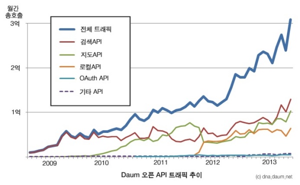 [아이티데일리] 다음커뮤니케이션(대표 최세훈)은 외부 기업, 개발자에게 제공하는 오픈 API의 사용 건수가 2013년 10월 기준 월 3억건을 넘어섰다고 발표했다.