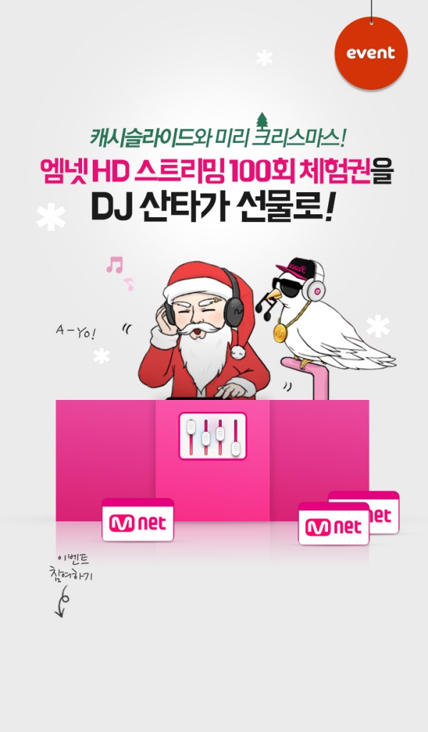 크리스마스를 맞아 더욱 많은 이용자들이 선명하고 또렷한 음원을 경험할 수 있도록, 캐시슬라이드와 제휴를 맺고 ‘엠넷닷컴 HD 스트리밍 무료 체험권 받기 이벤트’를 진행한다는 것. 캐시슬라이드 이용자 중 이벤트에 참여한 선착순 3만 명에게, 고음질 음원을 100회 감상할 수 있는 엠넷닷컴 HD 스트리밍 무료 체험권을 증정한다.